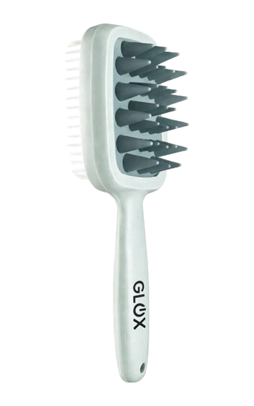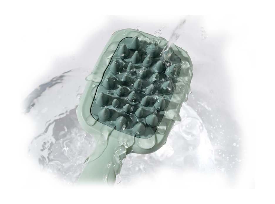 Kartáč je vybaven dvěma typy pružných zubů, které zajišťují důkladné čištění i příjemnou masáž pokožky hlavy.
